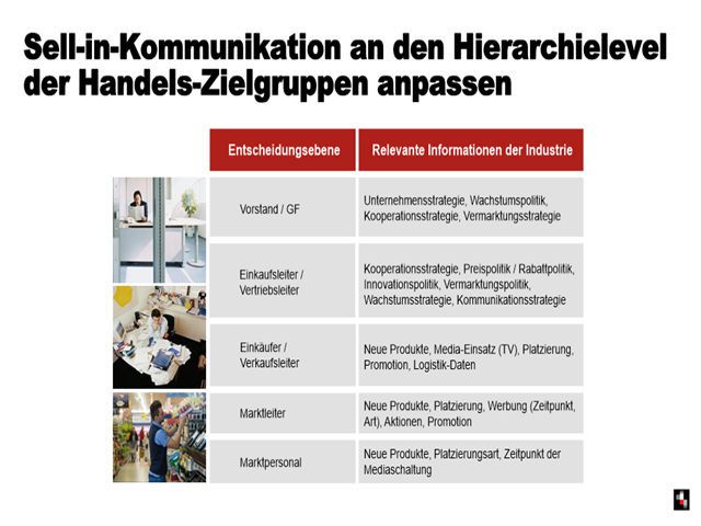 Entscheidend, um beim Sell-in noch erfolgreicher zu werden, ist die Umsetzung der Unternehmenspositionierung in der konkreten Zusammenarbeit mit allen Ansprechpartnern im LEH. Der richtige Kommunikationsmix berücksichtigt, dass die verschiedenen Zielgruppen im Handel unterschiedliche Informationsbedarfe haben: Denn der Einkaufsgeschäftsführer in der Zentrale eines Händlers mag sich für die strategische Ausrichtung seines Industriepartners interessieren und wie die daraus abgeleiteten Neuproduktkonzepte aussehen. Ein Marktleiter desselben Handelsunternehmens dagegen möchte vom Außendienst seines Industrielieferanten wissen, wann genau der Lieferstart eines neuen Produktes ist, und ob der Launch mit TV-Werbung unterstützt wird oder nicht.