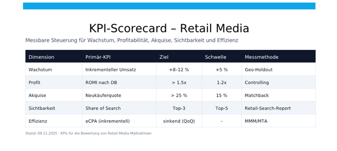 - Guardrails: Obergrenzen als % vom Kategorie-Umsatz, Mindest-Inkrementalität pro Händler/Format.