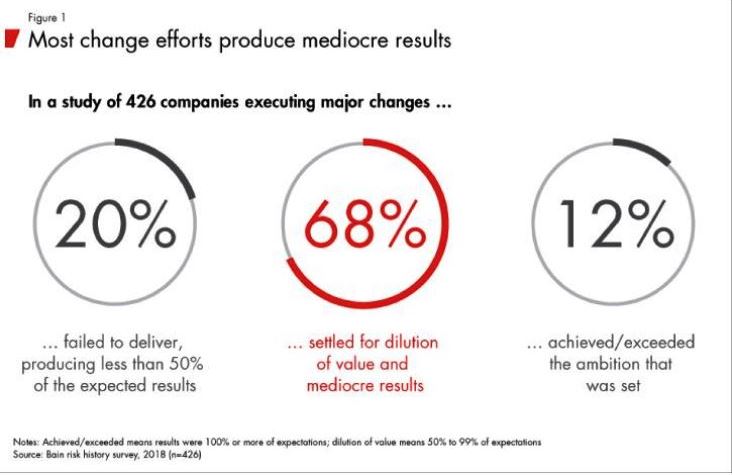 Rund um den Globus investieren Unternehmen jedes Jahr viele Milliarden in die Neuausrichtung ihrer Geschäftsmodelle und ihrer Organisationen. Doch nur ein Bruchteil erreicht die mit der Transformation verbundenen Ziele. So hat die internationale Managementberatung Bain & Company in ihrer Studie „Soul Searching: True Transformations Start Within“ ermittelt, dass lediglich 12 Prozent der Unternehmen Transformationsprogramme in vollem Umfang erfolgreich abschließen. Mehr als zwei Drittel bleiben hinter den Erwartungen zurück und erzielen nur mittelmäßige Ergebnisse. Befragt wurden für die Studie weltweit mehr als 400 Topmanager, die in jüngerer Zeit ihre Unternehmen umfassend umgebaut haben.
